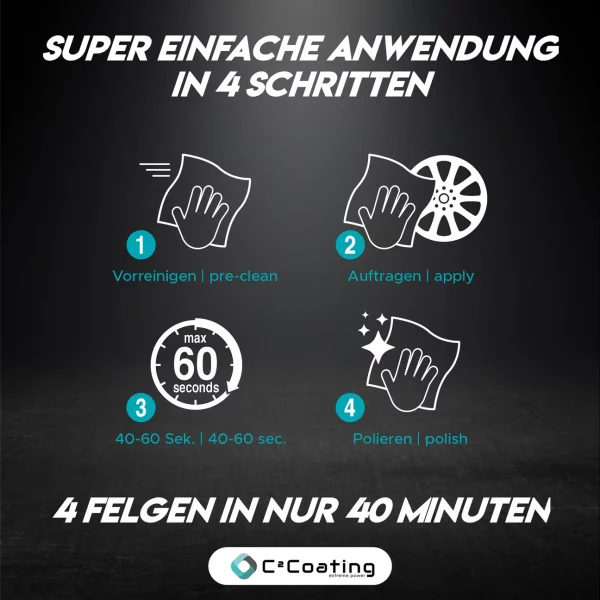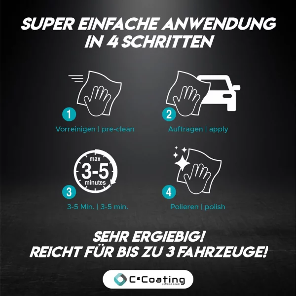 Ohne aufwendiges Polieren oder Aushärten – einfach auftrage, nach 2-3min abwischen – 24 Stunden aushärten lassen. Von Detailern getestet und empfohlen.