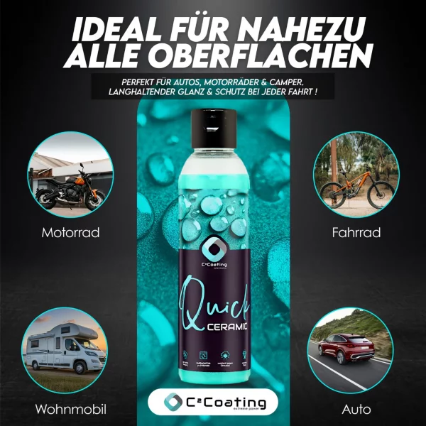 Perfekt zur Auffrischung bestehender Keramikbeschichtungen geeignet. Die Quick Ceramic verstärkt den bestehenden Schutzfilm und sorgt für neuen Glanz.